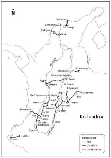 Lo anterior se puede entender por varios factores. El primero, la especialización, auge y consolidación de una economía agroexportadora basada en la producción de café; el segundo tiene relación con la consolidación de los núcleos urbanos fundados a lo largo del siglo XIX y parte del XX; y el tercero con las dinámicas de modernización de la infraestructura vial que de igual modo vive el país. Algunos autores como Alvear-Sanín (2008, 239) consideran que fue el café y no los ferrocarriles el catalizador del desarrollo económico. Ya a finales de la década 1950 la ruta del ferrocarril se puede apreciar del siguiente modo, gracias al mapa elaborado por Poveda-Ramos (figura 13).