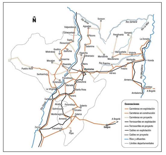 Figura 15: Caldas: red de carreteras, ferrocarriles y cables aéreos