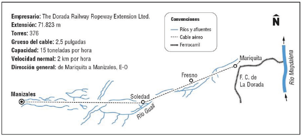 Según Duque-Escobar (2014, s.p.), "con el Ferrocarril del Pacífico quedaba en riesgo el monopolio británico del transporte por el Magdalena". Así, "llegando el tren a Cartago (1923) y luego a Manizales (1927), al abrirse la ruta por Buenaventura al Canal de Panamá (1914), si bien Honda no palidece, es porque gracias al cable aéreo diseñado para el movimiento de la preciada carga, y a los caminos de arriería que le precedieron para la salida al Magdalena, el grano de oro se constituyó en el motor del desarrollo del Norte del Tolima durante la primera mitad del siglo XX. Con el cable aéreo Manizales-Mariquita, el tiempo de transporte de mercancías pasó de 10 días a 10 horas". "Pero también, tras la construcción de la vía al Magdalena (1939) y su posterior rectificación (1951), dicho cable, en 1961 debe cerrar". Ver figura 16.