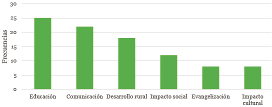Por otro lado, la figura 2 muestra que la educación ofrecida por Acción Cultural Popular es la que genera mayor interés, se debe a que la metodología implementada le permitió llegar a las zonas rurales más apartadas y precisamente la institución es conocida por el aporte que hizo a la reducción del analfabetismo en Colombia. En segundo lugar, se encuentra el tema de la comunicación que se refiere al uso combinado de la radio, la prensa y otros materiales escritos y auditivos en este sistema educativo. Luego encontramos una menor dedicación de los investigadores al análisis del desarrollo rural pues uno de sus propósitos era enseñar técnicas agrícolas más eficaces; a continuación, se ubica la temática del impacto social donde se busca definir si hubo un aporte concreto al mejoramiento de las condiciones de vida campesina. Por último, identificamos que las temáticas menos trabajadas son la evangelización, relacionada con el carácter religioso de la institución, y el impacto cultural, es decir, los cambios producidos en la forma de vida y valores campesinos.