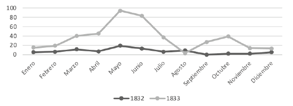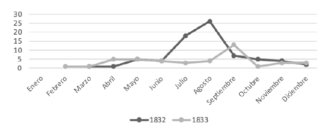 Por ejemplo, en 1832, 75 personas tuvieron como causa de muerte la diarrea, el primer caso se presentó en marzo, pero julio y agosto fueron los meses de mayor incidencia (figura 2), en septiembre comenzó el descenso, pero hubo casos hasta diciembre. El primer fallecido por diarrea, registrado en el libro de entierros de 1833, se encuentra en el mes de febrero; en marzo hubo otro caso, en abril cinco, en mayo cinco, y así, durante todo el año se anotaron muertes causadas por la diarrea. Pero, como se observa en la figura 2, en 1832 hubo más casos de diarrea que en 1833 y el pico se presentó en el mes de agosto.