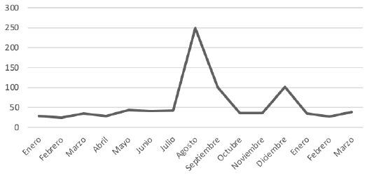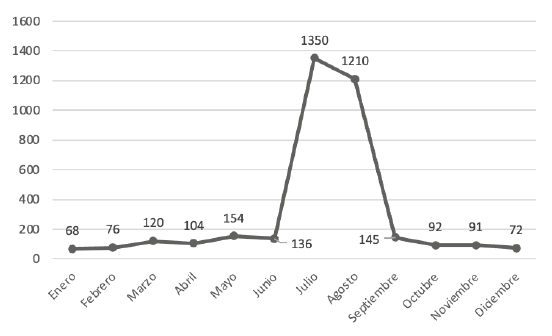 Al contar las muertes ocurridas durante el año de 1833, en la parroquia de Asunción de María (Aguascalientes) se puede observar que la mortalidad comenzó a aumentar desde febrero, pero es en mayo donde encontramos un pico previo al embate del cólera. En la figura 3, se aprecia que en febrero la mortalidad se incrementó, comparada con el número de entierros de enero. No obstante, es en marzo cuando se hace evidente el alza, en abril disminuye la mortalidad, pero se mantiene alta, vuelve a elevarse en mayo, para descender en junio. En julio, el número de entierros fue de 1350, lo que demuestra el feroz impacto de la epidemia de cólera en la ciudad de Aguascalientes.