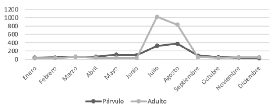 Esta evidencia del incremento de la mortalidad desde febrero podría indicar que el cólera si arribó a la parroquia de Aguascalientes desde mediados del mes de mayo. Pero al analizar la mortalidad diferenciada entre párvulos y adultos (figura 4) se puede distinguir que en los primeros meses de 1833 algo provocó el incremento de la mortalidad infantil.