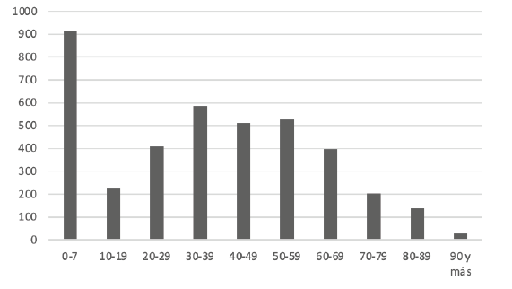 En la mayoría de los lugares aquí analizados, alrededor del 20 % de los muertos por cólera fueron párvulos, esto es niños desde cero hasta 7 años y 80 % adultos.18 Sin embargo, al estudiarse la mortalidad por grupo de edad, los niños de 0 a 7 años fueron el grupo de edad más afectado por el cólera, 24.58 % del total (figura 8 y tabla 5). Proporción que coincide con la encontrada en Guadalajara, 23.39 % (Oliver 2018, 139). Dentro del grupo de adultos, el vibrión colérico causó la muerte con mayor frecuencia a los que estaban en el rango de 30-59 años, quienes acumularon el 43.74 % del total de las muertes.