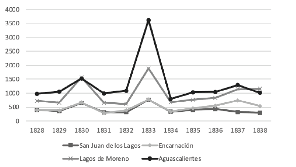 En la figura 9 aparecen las curvas de entierros de Aguascalientes, Lagos de Moreno, San Juan de los Lagos y Encarnación, 21 algunos de los lugares con más muertos por cólera. El primer pico de la curva (1830) refleja una epidemia de viruela. Durante ese año en Aguascalientes se enterraron a 1522 almas. En el segundo pico (1833), provocado por el cólera, se registró la defunción de 3617 personas. La mortalidad en Aguascalientes, comparada con otro año de sobremortalidad (1830), se duplicó. En las tres parroquias de Jalisco -Encarnación, San Juan de los Lagos y Lagos de Moreno-, las muertes durante el cólera también fueron mayores que durante la viruela, pero la diferencia es menos perceptible.