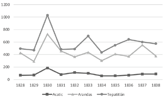 Mientras que en otros lugares como Acatic, Arandas y Tepatitlán la viruela, una enfermedad ya conocida desde el siglo XVI en América, para la cuál se había creado una vacuna desde 1798, que había sido introducida a la Nueva España en 1804, todavía seguía causando fuertes estragos en la población, sobre todo infantil. En la figura 10 se muestran los entierros ocurridos durante 11 años en los tres lugares antes mencionados, en ella se observa que la sobremortalidad fue mayor durante la viruela que con el cólera. Por el momento, no es posible explicar esa circunstancia, es probable que las condiciones contextuales como el aislamiento o el poco tránsito de sus caminos así como el almacenamiento del agua permitieran que los contagios no se multiplicaran como en otros lugares.