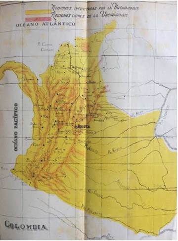 El doctor Martínez Santamaría elaboró, en su tesis publicada en 1909, uno de los pocos mapas que se conocen sobre la posible extensión de la anquilostomiasis. Su afirmación respecto al alcance geográfico de la enfermedad fue categórica: "la uncinaria solo ha respetado las altas cumbres de las cordilleras; el nudo en donde nacen las tres ramas, la Oriental, la Central y la Occidental; la sabana de Bogotá y la Sierra Nevada. El resto del país está infectado" (Martínez- Santamaría 1909, 23).