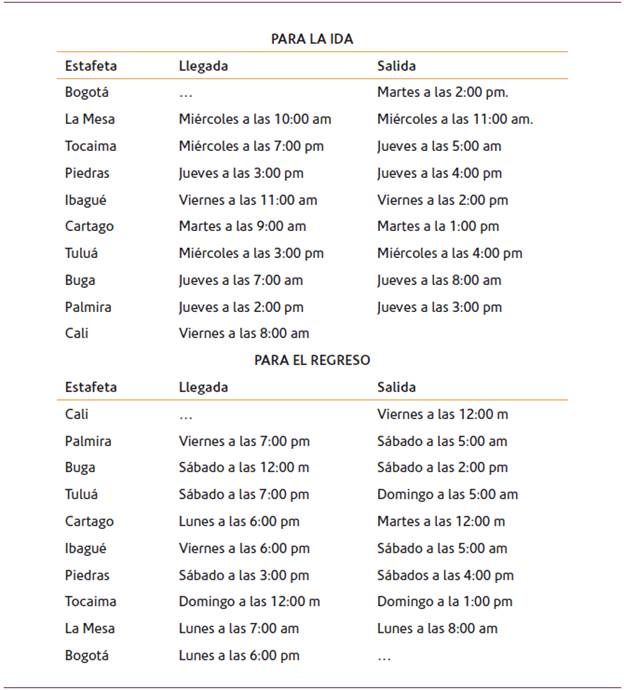 Tabla 1: Itinerario del correo del pacífico entre Bogotá y Cali7