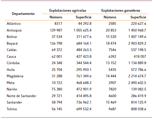 Tabla 1: Características de las explotaciones agrícolas y ganaderas totales por Departamentos de Colombia