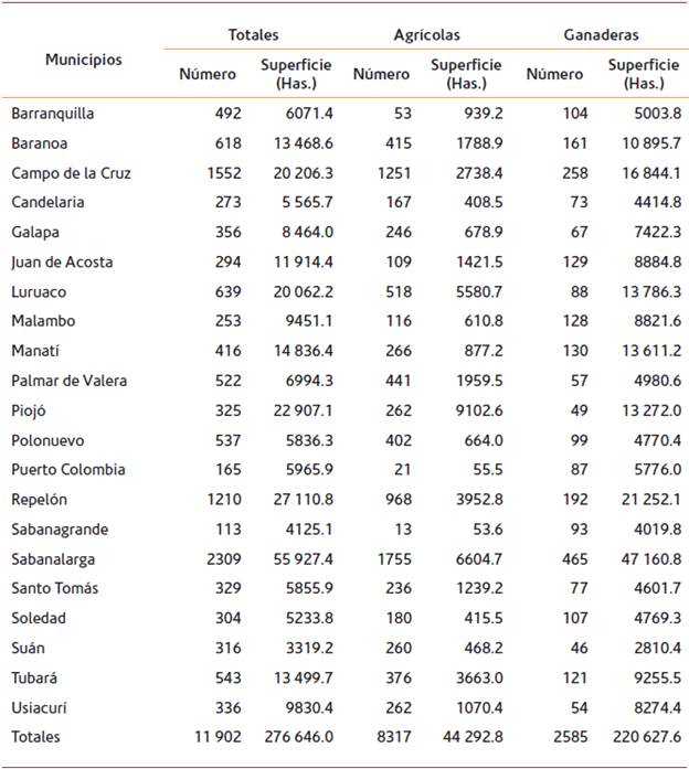 Para finales de los años de 1950 e inicio de i960 el departamento del Atlántico contaba con un total de 276 646 superficies, en hectáreas de tierras, para explotación agrícola y ganadera, de las cuales 44 292.8 estaban destinadas a la agricultura y 220 627.6 a la ganadería. No obstante, en número de tierras aptas para cada tipo de explotación la proporción variaba, aquellas que podían destinarse a la agricultura eran mayores que las que servían para la ganadería (tabla 2.). Por lo tanto, el potencial de los municipios del departamento para el desarrollo agrícola era muy alto, aunque el censo agropecuario evidenciara una subutilización de los suelos para el beneficio de la cría de ganado vacuno.