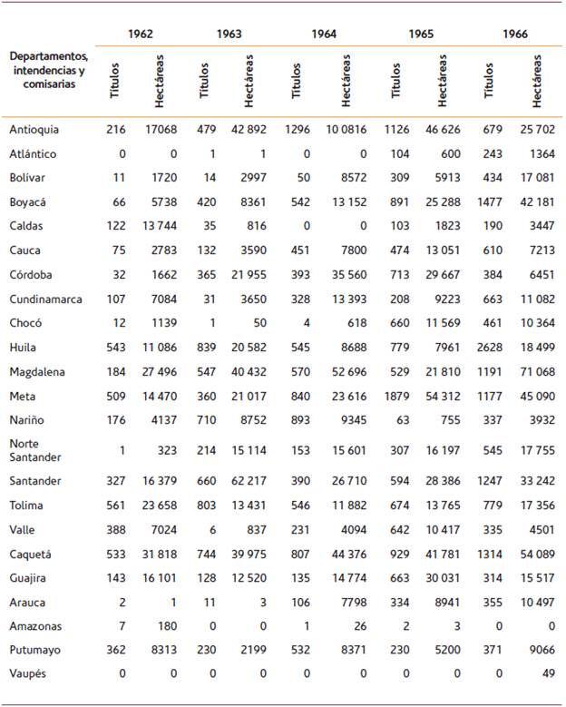 Ahora bien, lo anterior se cruza con los resultados en materia de adjudicación de tierras en el departamento del Atlántico. Según fuentes de información producidas por el INCORA, entre 1962 y 1966 la titulación de tierras en el departamento fue muy baja en comparación con los demás departamentos, intendencias y comisarías del país. Además, mientras que en el resto de Colombia comenzaron a adjudicar tierras desde inicios de la reforma, en el Atlántico se hicieron las primeras titulaciones en 1965, momento en el que estaba en marcha el proyecto de riego y recuperación agrícola del sur del departamento (tabla 3). Para ese momento, varios campesinos recibieron tierras en los municipios de Repelón y Manatí, prioritarios en el proyecto Atlántico n°. 3, lo que llevó a la disminución de invasiones dirigidas por los sindicatos agrarios (CNMH 2017).
