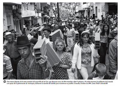 Tres días después del ataque, el 9 de diciembre, la población de Granada se movilizó en contra de la violencia de la que era objeto, tanto de las AUC como del ELN y las FARC. Jesús Abad Colorado capturó una imagen hoy en día emblemática: la de los granadinos, en medio de los escombros, marchando con una pancarta gigantesca que decía “Territorio DE PAZ”. Inicialmente, la fotografía fue publicada en la portada del periódico El Colombiano el 10 de diciembre de 2000 con las consabidas reglas periodísticas: una fotografía en medio de imágenes y textos de cualidades diferentes (figura 4). En ese sentido, la exposición de la fotografía es borrosa. El marco visual en el que se exhibe desenfoca la imagen, la subexpone: informa sobre el hecho pero no captura ni retiene la mirada; no es una imagen para el mañana sino más bien para el olvido, pues insertada en lo periódico, es decir, en lo reiterado, la obsolescencia es su destino.