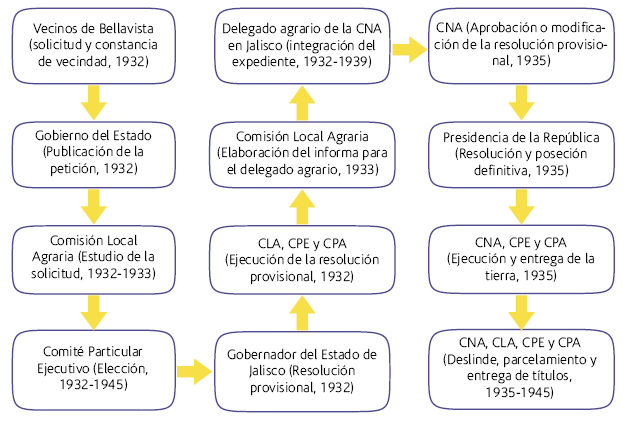 Este trabajo analiza la forma como se implementó el reparto agrario (figura 1) en la localidad de Bellavista (estado de Jalisco), entre 1932 y 1945; a partir de fuentes primarias poco exploradas como los expedientes de dotación de tierras del Registro Agrario Nacional. Esta documentación se revisó debido a que la legislación agraria, que implementó el gobierno revolucionario, especificó el proceso y los trámites que debían seguirse para obtener tierras.1
