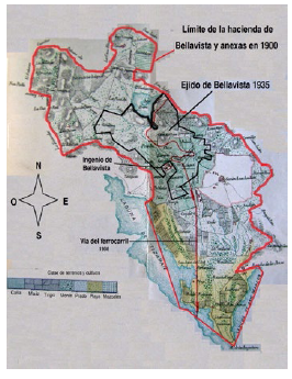 Figura 3: Plano de las haciendas de Bellavista, El Plan y Las Navajas en 1900, y del ejido de Bellavista de 1935