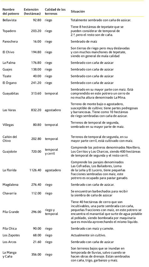 Al final de la inspección, el 6 de noviembre de 1935, se levantó un acta en la cual se consignó, con la mayor precisión posible, cada uno de los diversos aspectos de lo expuesto por los miembros del comisariado. Aplicar en los hechos la resolución presidencial no fue sencillo, porque se tenía que respetar el fallo en dos puntos esenciales: 1) dotar al ejido con 705 hectáreas (en adelante has.) de riego, y 2) respetar a la finca una extensión de 416.91 has., de terrenos sembrados con caña. Por otra parte, algunos terrenos que les fueron otorgados a los ejidatarios estaban sembrados con caña al momento de la entrega formal, pero la siembra de dicha caña la había hecho el propietario de la hacienda, por tanto, según lo especificado por la ley, estos sembradíos de caña se tenían que respetar hasta que la caña sembrada rindiera sus frutos y pudiera ser cortada por el propietario de la finca, esto llevaría de uno a tres años, sólo después de ese periodo, los ejidatarios podrían tomar posesión real de dichos terrenos. El problema se centraba en 104 has., para solucionar este asunto se les dieron provisionalmente a los ejidatarios una extensión similar, pero en los terrenos del potrero denominado El Plan, propiedad de la hacienda.23
