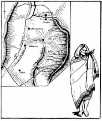 Sin duda estos dos elementos reunidos, mapa de los límites y los hitos y representación de una vivienda típica, facilitaban la función de rememoración o al menos la asociación de un espacio geográfico con una cultura. En el caso del texto sobre los Guane, este recurso se logra de mejor manera, de un solo marco aparece en el costado izquierdo el mapa del territorio, en el que se recrea de manera más o menos naturalista la topografía del lugar, mientras que al lado derecho se presenta la imagen un indígena con su indumentaria típica, aspecto que Jiménez resalta en su texto, caracterizando a los Guane como un pueblo tejedor y cultivador de algodón (figura 5), pues el museo contaba con algunos fragmentos de mantas con diferentes tipos de decoración, provenientes de esa zona (Jiménez 1945, 256).