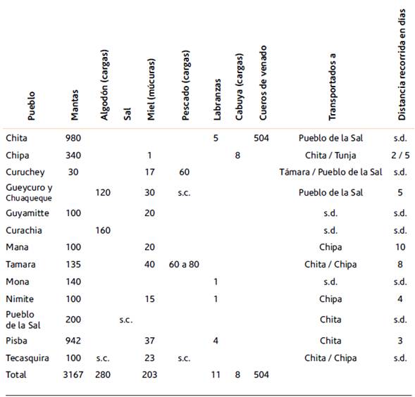 Fuente: AGN, Visitas-Boy: SC.62, 2, D.1, “Motavita, Chiscas, Pisba, otros: diligencias de visita”, 1571, f. 51r y 282v- 285. s.c.: sin especificar cantidad; s.d.: sin especificar distancia.
