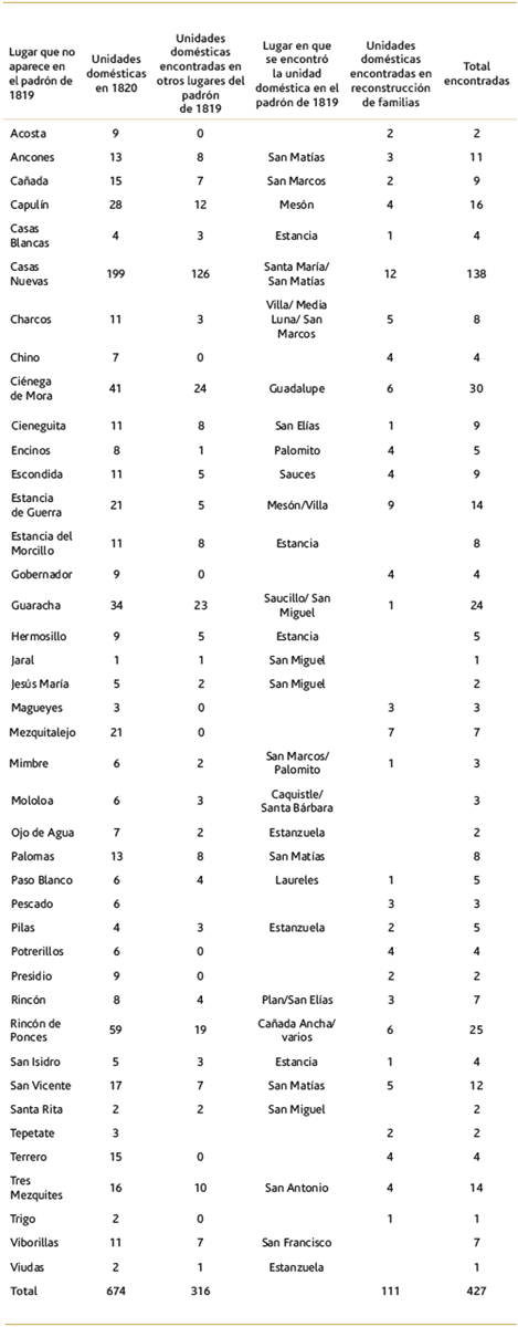 41 lugares habitados por 674 unidades domésticas, que fueron empadronados en 1820, no fueron anotados en el padrón de 1819. Pero al hacer una búsqueda, persona por persona, lograron ubicarse 427. De ellos, 316 que fueron registradas como residentes en lugares distintos a los que establecía el padrón de 1820. En la base de datos de reconstrucción de familias fue posible ubicar otras 111 unidades domésticas. Esta indagación de personas y lugares, en diversas fuentes de información, sirvió para comprobar que en el padrón de 1819 hubo subregistro, tanto de lugares como de individuos.