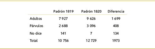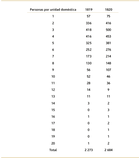 En el padrón de 1819 se registraron 10 756 personas agrupadas en 2 273 unidades domésticas. En el de 1820 se anotaron 12 729 personas, que conformaron 2 684 unidades domésticas. Según los padrones, de un año a otro hubo 1 973 nuevos habitantes y 411 nuevos hogares. No obstante, por crecimiento natural la población solo debió aumentar en 527 personas (Torres 2019). Según los datos de la tabla 2 fue la población adulta la que creció, por lo que se podría considerar que dicho incremento correspondió a la migración de adultos. Pero como se verá más adelante, la diferencia de 1 699 adultos estuvo causada por el subregistro de familias en el padrón de 1819.