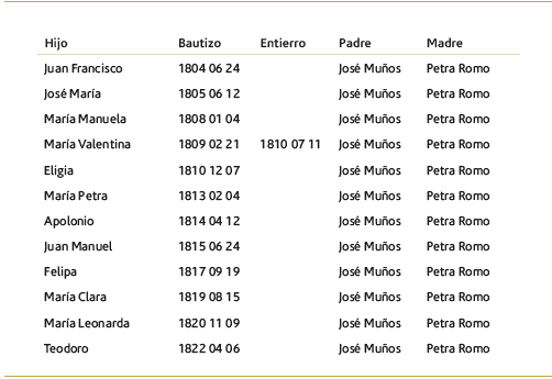 En la misma situación estuvo la familia Muños Romo. José Muños y Petra Romo pertenecían a la élite local. En las partidas de bautizo aparecen con el título de don. Se casaron en febrero de 1803 y tuvieron doce hijos entre 1804 y 1822 (tabla 3). A pesar de haber bautizado a María Clara en 1819 no fueron empadronados ese año. En el padrón de 1820 se estableció que la familia Romo vivía en Soledad, pero ninguna de las partidas de bautizo parece coincidir con ello, puesto que todas indican que moraban en Los Lomelines. No parece probable que esta familia hubiera dejado la parroquia de Encarnación por un año.