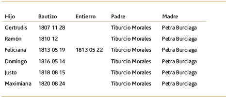Uno de esos casos que dan sustento a la afirmación anterior es el de la familia conformada por Tiburcio Morales y Petra Burciaga. Tiburcio Morales se casó en primeras nupcias el año de 1789 con Lucrecia Olmedo, tuvieron dos hijos: Margarita y León. Enviudó en 1805, volvió a contraer nupcias en 1806 con Petra Burciaga y bautizaron seis hijos entre 1807-1820 (tabla 4). No fueron empadronados en 1819 pero sí en 1820, donde aparecen viviendo en Tigre con otras cuatro personas: Gertrudis (adulta) y con los párvulos Ramón, Domingo y Justo. En la tabla 4 aparecen los nombres y las fechas de bautizo de los seis hijos de Tiburcio Morales y Petra Burciaga. La familia completa fue registrada en el padrón de 1820, ya que Feliciana había muerto en 1813, Maximiliana aún no nacía y los hijos del primer matrimonio de Tiburcio ya se habían casado.