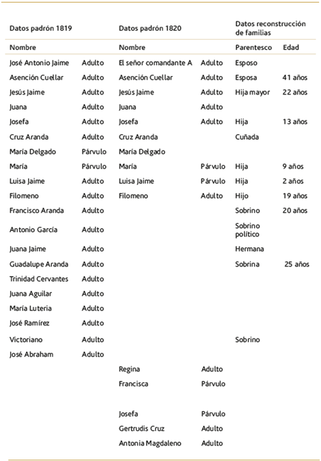 Se recurrió a la reconstrucción de familias para saber quién es quién en el mencionado hogar. José Antonio Jaime estaba casado con Asunción Cuellar desde 1796; ellos bautizaron doce hijos entre 1797 y 1820. En el padrón de 1819 está unidad doméstica estaba formada por varias familias nucleares que, en su mayoría, eran familiares. En el padrón solo se enlistaron cinco de los doce hijos de José Antonio Jaime y Asunción Cuellar, faltarían: Onofre de 21 años, María Pragedis de 17 años, Ramón de 15, Ignacio de 11, María Merced de 4, Cirilo nacido en 1819 y Eulogio quien nacería en 1820.