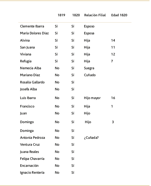 Sin embargo, en el padrón de 1819 la unidad doméstica registrada después de la de Clemente estaba encabezada por Mariano Díaz, con él vivían: Rosalía Gallardo, Nemecia Alba, María Apolinaria, José María y Antonia Pedroza. Queda la duda de si en 1820 estas dos familias de parientes vivían en la misma unidad doméstica, o si fueron empadronados juntos por error; es decir, que quien elaboró el padrón no puso la línea divisoria entre los dos hogares. De igual forma, es imposible saber si los cinco últimos mencionados en el cuadro integraban una casa aparte o si eran personas que trabajaban en el hogar de Clemente Ibarra.