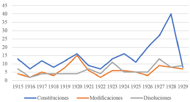 Figura 1: Registros de constitución, modificación y disolución de empresas, 1915-1929