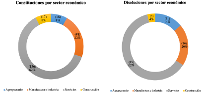 El sector económico que abarcaba la mayor proporción de empresas constituidas durante este período es el de servicios (136), seguido por los de manufactura e industria (48), agropecuario (18) y el sector de construcción (17). Al observar los registros de constitución y disolución,13 analizados a partir de la división de los objetos de los sectores mencionados -agropecuario, servicios, construcción y manufactura e industria-, no parece existir un comportamiento particular que impacte más a alguno de los sectores económicos para conducirlo a su liquidación. Aunque en menor medida, la misma proporción de constitución se mantiene para la disolución de las empresas, como se ve en la figura 2.