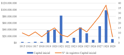 Las dos figuras evidencian además la enorme caída que se presentó en 1929, incluso antes de la crisis de octubre de ese año, tanto en registro como en el monto de capitales iniciales o invertidos, señalando el fin de un ciclo económico que sólo se recompondrá a mediados de la década siguiente.