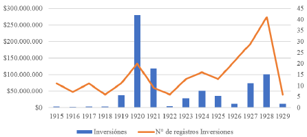 Las inversiones cuantiosas se dieron en 1920 y bastante menos en 1921, datos que, junto a los registrados en el párrafo precedente, señalan que en el inicio de la década se formalizaron las principales actividades en términos de inversión de capital.