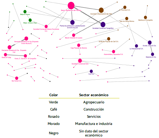Asimismo, es posible ver que esta diversificación en el sector agropecuario tuvo más vínculos con una industria de alimentos que con el sector financiero. Esto supone que la trasformación de materia prima era igual o más importante que la consecución de liquidez financiera por vía de obtener acciones en el banco. También vale la pena resaltar que existió un grupo de artesanos y trabajadores que lograron organizarse alrededor de sociedades comerciales, gremiales y mutuales con tal importancia que hacen parte de la red de empresas que indica la figura 5. Algunos de sus socios tuvieron presencia en la Caja Popular de Ahorros y la Sociedad de Carpinteros y Ebanistas de Cali y el Sindicato Popular de Cali S.A. La primera funcionaba como un fondo de ahorros, la segunda como una agremiación para prestar servicios y la tercera era una sociedad en la que se proponían construir viviendas para los asociados.