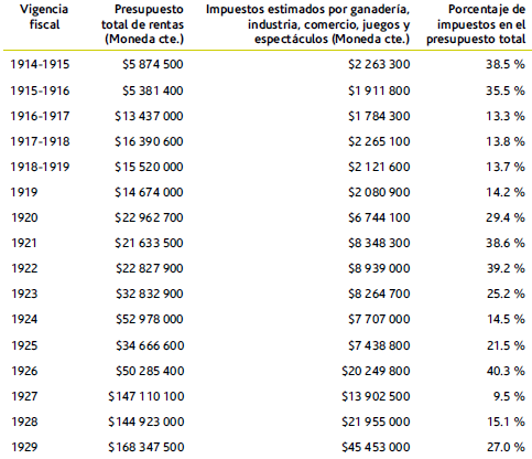 Tabla 1: Presupuesto total de rentas e impuestos totales de ganadería, industria, comercio, juegos y espectáculos 1915-1929