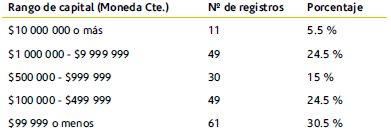 Como lo muestra la tabla 3, cerca de la mitad de las empresas estudiadas (55 %) aportaron pequeños capitales para iniciar sus negocios, llegando máximo a valores de $499 999 pesos moneda corriente. El 24.5 % de las empresas iniciaron con capitales medianamente altos, entre $1 000 000 y $9 999 999, pero definitivamente fueron pocas (el 5.5 %) las que lograron reunir grandes capitales.