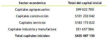 La distribución de los capitales iniciales entre los sectores económicos indica marcadas diferencias. El sector servicios, el que más empresas constituyó, soportaba el grueso del capital inicial registrado. Los sectores más pequeños en términos de número de empresas fueron el sector de la construcción (17 empresas) y el sector agropecuario (18 empresas), pero son a su vez los que dispusieron de capitales más grandes, incluso con respecto al sector de manufactura e industria, el cual registró 48 empresas (ver tabla 4).