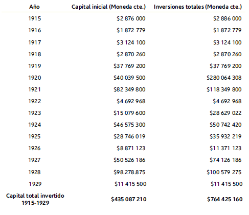 Tabla 5: Total capital inicial e inversiones 1915-1929