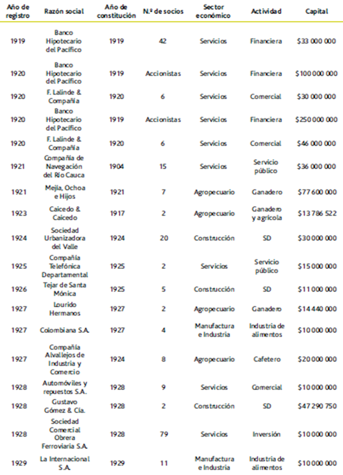 Teniendo en cuenta la tabla 6, se puede afirmar que los mayores aportes de capital por empresa son los que más socios reunieron, si se considera que el 77 % de empresas eran sociedades de no más de tres inversionistas. Es decir, las empresas con los mayores capitales pueden estar indicando que tales cifras se sostenían por la suma de aportes individuales, en algunos casos bastante moderados. Sin embargo, varias firmas lograron capitales sociales importantes con tan solo los aportes de dos socios. Debe distinguirse que estas son empresas de propiedad de personas identificadas como de élite regional, los Caicedo y Lourido, por ejemplo. En el caso de la Compañía Telefónica Departamental, los socios fueron el comerciante Emanuel Pinedo y la Gobernación del Valle del Cauca, en cabeza del gobernador Manuel Antonio Carvajal, lo que supuso abundancia de capitales. Todos los sectores económicos participan, en algún grado, en la lista de la tabla 5, pero es el BHP la empresa de mayor inversión, coincidiendo con el inicio de la década del veinte.