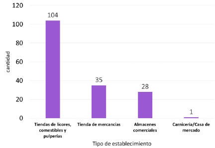 Las tiendas de licores, comestibles y pulperías ocupaban el 62 %, las tiendas de mercancías el 21 %, los almacenes el 17 % y finalmente la carnicería y casa de mercado apenas llegaba al 1 %. A continuación, se caracterizan rasgos de cada renglón. Las tiendas de licores y comestibles y pulperías eran locales de base familiar;10 demandaban poco espacio, requerían poca inversión y eran aprovechadas al máximo. Si se confía en las cifras del censo, con 11 595 habitantes, correspondía una pulpería por cada 112 pobladores. Asimismo, se debe considerar ventas de pequeños kioscos ubicadas por caminos y parajes al margen de toda oficialidad y control policial.