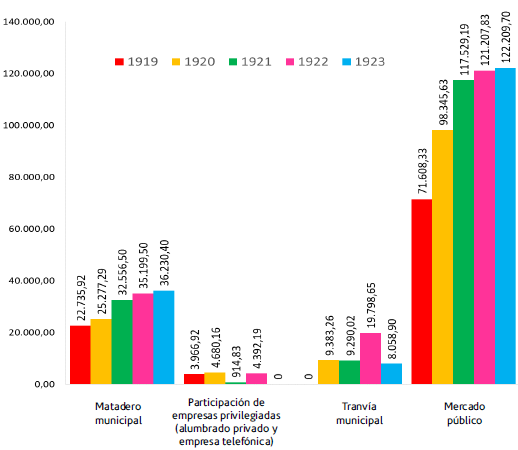 En la década de 1920, el erario local se formalizó con más regulaciones. Lo cual, se justificó por el presupuesto del Concejo Municipal preparado en 1924.49 En materia de rentabilidad ese informe mostró el recorrido de las rentas que produjeron varios bienes municipales entre 1919 a 1923. En la figura 3 se extrajo una síntesis, en perspectiva, el valor inicial del cobro del Mercado Público en 1919 ($71 608,33) al cobro de 1923 ($122 209,70) tuvo un incremento del 70.6 %. Con estas cifras se captó la progresiva rentabilidad del Mercado Público en ese lustro.