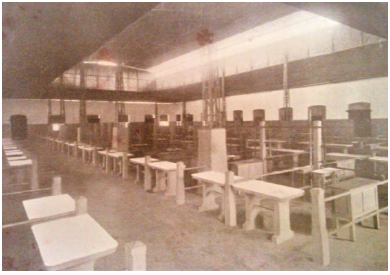 La primera intervención en el Mercado Público fue el pabellón de carnes. Este quedó con 116 cuartos dispuestos con mesas de cemento con topes esmaltados y lavamanos con servicio de agua corriente (ver figura 4). Todo el conjunto se restauró con estructuras de hierro y acero (Empresas Públicas Municipales 1928, 321). Las EE.PP.MM velaron por la pulcritud, orden, higiene y conservación de pintura y acabados. Estas disposiciones espaciales atrajeron a la clientela, permitiéndose una cómoda apropiación y uso del Mercado (ver figura 5 ). Bajo esta administración, se contempló la creación de numerosos espacios de expendio, accesos de carga y descarga, área de circulación de clientes en las vías laterales, servicios sanitarios y zona administrativa para el cobro de impuestas y de control de precios, pesos y medidas. La consideración con menor vigilancia fue la protección climática, pues en las épocas pluviosas, el crecimiento de arroyos y de los canales afectó la integridad material del edificio.