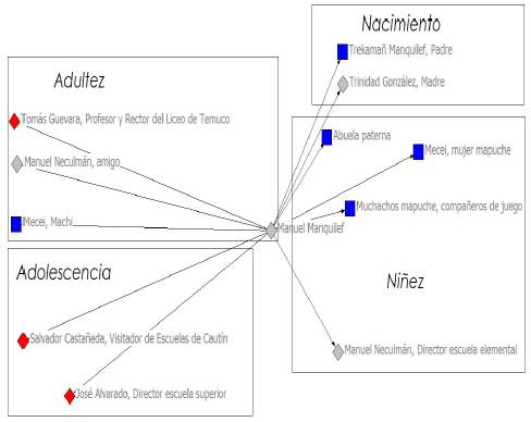 Figura 2: Red egocentrada de la vida de Manuel Manquilef, desde su nacimiento hasta los 23 años de edad