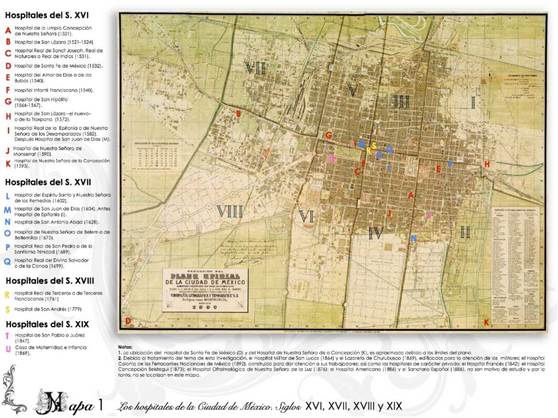 Figura 1: Hospitales de la Ciudad de México, siglos XVI al XIX