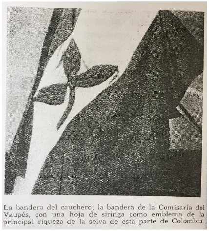 Según Schultes (1952, 14-15), el Vaupés es la "única comisaria de Colombia con una bandera gremial que a la vez puede representar [...] a todos los habitantes de la industria", y es la primera vez que "la Hevea ha llegado a tener ese honor entre los emblemas que suele utilizar el hombre, para simbolizar las cosas que ama". El 6 de julio de 1951, el comisario hizo entrega oficial de la bandera y la dedicaba a los "caucheros capitanes sin miedo y sin tacha, enamorados de la selva, de sus ríos, de sus peligros", diciendo que: