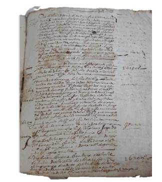 Además de los datos relativos al lugar y fecha del matrimonio y amonestaciones, Bartolomé recoge también una cita de la documentación legal asociada al matrimonio: Las escrituras se hisieron ante Juan de pineda escrivano público bísPera de pascua del dicho año de 1615 años,16 una nota que muestra la importancia de tener localizada la documentación relativa a los asuntos genealógicos y patrimoniales de la familia.