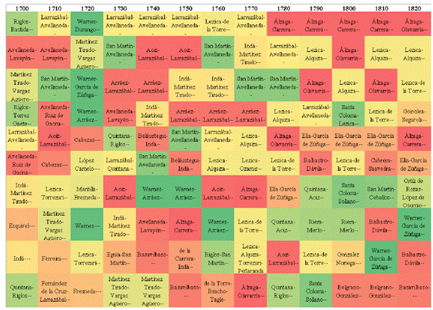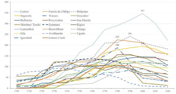 Es probable que el inicio de la red de familias pueda ubicarse hacia fines del siglo XVII ya que la evidencia nos muestra, como ejemplo de eso, el caso de cuatro familias que dieron lugar a la configuración de grupos familiares que se expandieron a lo largo del periodo que abarcan las figuras. Se trata de las familias que resultan de los matrimonios de Gaspar de Avellaneda y Juana de Lavayén, de Juan Martín de Lizola y Ana de Escobar, de los hijos de Juan de Lezica y María de Torrezuri y del grupo familiar Basavilbaso-Azcuénaga.