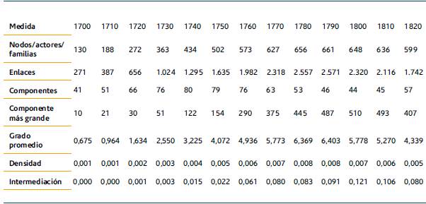 La información estructural de las redes brinda interesantes detalles de su evolución (Jackson, Rogers y Zenou 2017). La tabla 1 resume en datos la evolución de las redes por décadas desde 1700 a 1820. Utilizando, como señalamos anteriormente, ventanas temporales de 70 años, la red alcanza en 1790 un máximo de 661 actores -familias nucleares- presentes y 2571 relaciones identificadas. Las redes nunca se encuentran completamente conectadas, es decir que no existía un enlace directo o indirecto entre ciertos grupos de todos sus miembros. Cuando eso ocurre, se pueden crear "islas" de conexión entre grupos desconectados. Estos grupos desconectados se denominan componente, v.g., un conjunto de nodos en el que todos los pares tengan al menos algún sendero que los conecte. Se aprecia en la tabla 1 que siempre existieron como mínimo 40 componentes o, incluso, el doble, en décadas como 1740. Muchos de ellos resultaron ser pares de actores aislados -matrimonios sin descendencia y desconectados del resto en algún periodo-. De los componentes más grandes -también llamado componente gigante bajo algunos criterios-, el mayor se encuentra en 1800, con 510 familias nucleares. Eso es importante porque del componente gigante se obtienen las principales métricas de importancia individual de las familias nucleares. Finalmente, la tabla 1 nos presenta información estructural de densidad, es decir la cantidad de enlaces efectiva respecto a las potencialmente factibles. Estructuralmente, las redes matrimoniales son ralas -o sea, con poca densidad, no estando todos los nodos conectados entre sí (Newman 2005; White 2004, 2005)- dada la naturaleza de las relaciones.