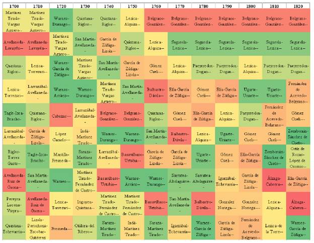 Finalmente la tabla 4 presenta el ordenamiento por centralidad de autovector de nodo, la cual es una medida de importancia estructural. Las familias así ordenadas representan a aquellas que se encuentran articuladas con familias bien conectadas. Y aquí los ordenamientos se asemejan a los resultados de la centralidad de grado (tabla 2) aunque cambian los tiempos de preeminencia. Así, al principio del periodo inicial muestra familias como Warnes -familias nucleares Warnes-Durango, Warnes-García de Zuñiga, Warnes-Arráes- y Martínez Tirado -familias nucleares Martínez Tirado-Vargas Agüero, Martínez Tirado-Fernández de Castro, Sarasa-Martínez Tirado-, entre otros, como preeminentes, en las primeras décadas de la red de familias nucleares capitulares. Avanzando el periodo, el clan Belgrano -núcleos familiares Belgrano-González, Fernández de Acevedo-Belgrano, González-Casero, Calderón de la Barca-Belgrano, Belgrano-Cabral, Chas-Belgrano y Belgrano-Sanchez- domina completamente las décadas de 1760 a 1790. Para las décadas de 1800 a 1820 los apellidos Lezica, Segurola y Elorriaga se llevan las influencias cruzadas más diversas en los primeros veinte puestos con el posicionamiento de las familias nucleares Segurola-Oliden/Seguro-Lezica, mencionado anteriormente, Elorriaga-Segurola -matrimonio del cabildante Juan Bautista de Elorriaga Urizar y María Leocadia Segurola Lezica y descendencia-, Lezica-Alquiza -matrimonio de Francisco de las Llagas Juan José de Lezica Alquiza y María de la Nieves de Reyna Vazquez y Fernandez de Cáceres y descendencia-, Goicolea-Segurola -matrimonio de Juan Antonio de Goicolea Larraondo y María Benita Segurola Lezica-, Ortiz de Basualdo-Segurola -Manuel Ortiz Basualdo y María de la Cruz Segurola Lezica y descendencia-, entre otros.
