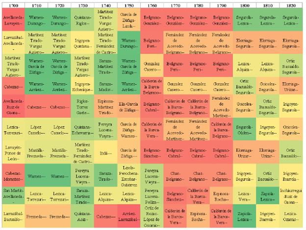 En este sentido, parece claro asociar el ciclo vital de estas familias con estos ciclos de preeminencia familiar dentro de la red según algún criterio de importancia en la red. Como se aprecia existen largos periodos en que la posición estratégica de algunas familias en este contexto permanecía incólume.