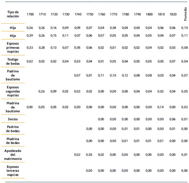 Se observa como la red se va poblando de enlaces a medida que avanza el siglo XVIII siendo las primeras décadas representadas por redes ralas. Asimismo, la escala de colores ayuda a percibir una fuerte preeminencia de los hijos de ambos sexos durante todos los periodos, algo natural dado que se ha formado la red a través de matrimonios y su descendencia. A partir de la década de 1780 los matrimonios también emergen como lazos importantes para conectar la red. Del mismo modo, tímidamente a partir de 1770 las relaciones rituales definidas en la tabla de la figura 4 empiezan a mostrar una presencia más marcada para conectar espacios alejados de la red.