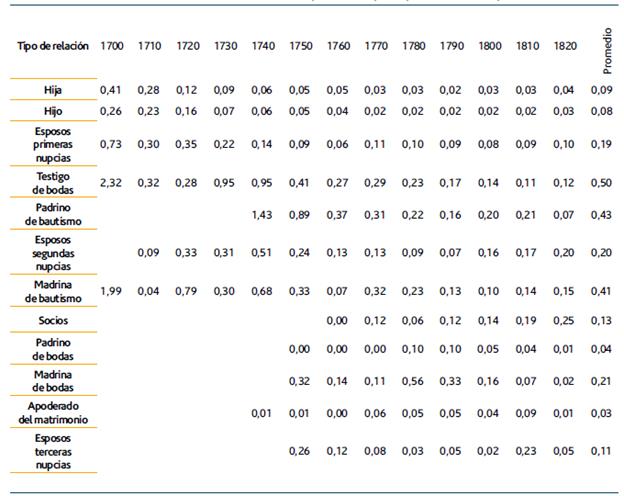 En este sentido la densidad más alta se presenta entre los decenios 1780 y 1790, periodo de gran crecimiento a través de migraciones desde la metrópoli, la bonanza económica, aspectos que coinciden también con el impacto de las reformas borbónicas en el Río de la Plata, entre las cuales destacamos medidas como el auto de libre internación (1777) y el Reglamento de libre comercio (1778) y lo que se suma el propio crecimiento poblacional de la ciudad de Buenos Aires. El grado promedio determina cuántas relaciones directas desarrolla una familia nuclear para cada decenio: obsérvese cómo la cantidad de enlaces crece considerablemente a la par que se conforman y procrean las familias nucleares, llegando a máximos en los mismos decenios de mayor densidad. Finalmente, la intermediación de red representa el valor de centralidad de intermediación promedio de las familias nucleares, es decir que expresa cuándo actúan como puentes en grupos alejados. El año 1800 marca el máximo de este valor, siendo entonces el periodo en donde ciertas familias ejercen un rol de conexión con el resto de la red más preponderante.